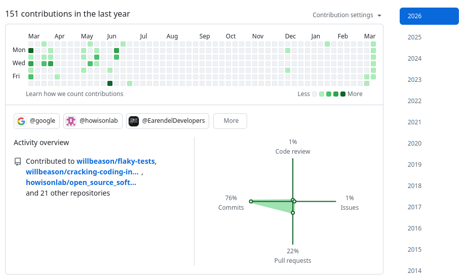 I have more thoughts (What makes a “healthy” repository? What things make a repository attractive to a newcomer? How do you get started in open source?), but they don’t fit cleanly here. I’ll have to cover them another time.