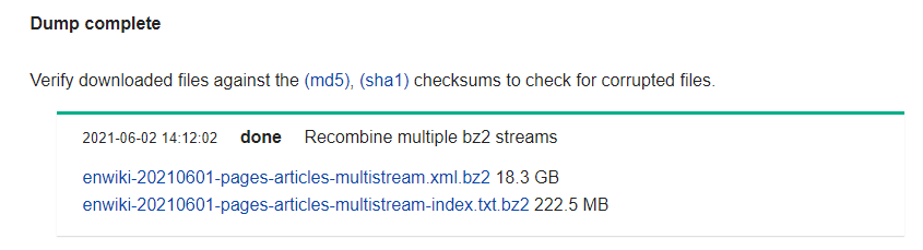You want to download these two files, “pages-articles-multistream” and “pages-articles-multistream-index”. Note that the date the dump was created is part of the file name.